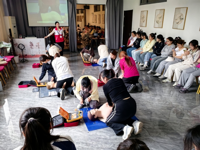 培训分为急救理论与实操演练两大模块。理论环节中,老师通过真实案例与数据分析,深入讲解了急救“黄金四分钟”的重要性、常见意外伤害的应急处理原则,以及健康卫生常识。聚焦止血技术,系统介绍了止血操作要点,强调“垫、打、结、绞、紧”五步规范流程与后续固定、标记的注意事项。学员们全程专注聆听,积极互动提问。实操考核环节,两位老师分组指导学员进行技能演练。现场演示了心肺复苏(CPR)的标准流程,并详细讲解自动体外除颤仪(AED)的使用场景与操作规范。学员们分组实操、反复练习,两位老师全程跟进纠正细节,最终全员通过技能考核。