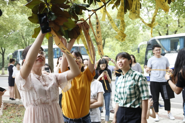 毕业生们在玉兰树上挂上丝带