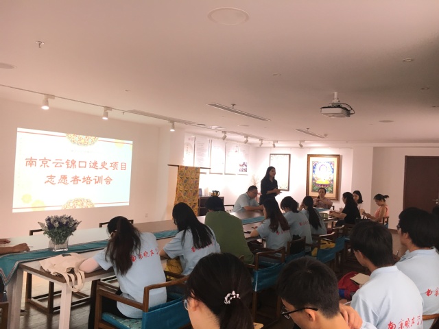 在项目开始前的培训会上,南京市档案局史料开发利用处副处长王伟、江南丝绸文化博物馆馆长耿奇、副馆长马培培和指导教师肖妍娜分别就南京丝绸与云锦发展现状、南京云锦历史、云锦工艺、中兴源丝织厂及云锦档案口述工作方案做了专题培训。