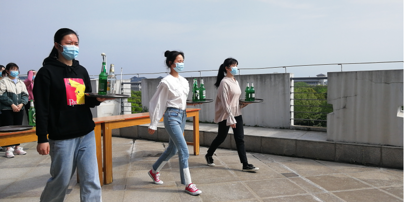 4月16日下午,酒店管理专业余子萍老师的餐厅实训课成为伟德victor1946网站首个线下实践课程,为了保证同学们的安全,余老师将员工分成两个授课班,授课地点选在在文南四楼的露台进行。在经过近两个月的线上教学后,同学们在课堂上非常活跃,余老师不断提醒同学们保持适当距离,在实操中,将原先的8人一组改为4人一组,增大同学们的安全距离,公司党政领导旁听了课程。