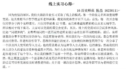 历史师范专业负责人在总结时表示,虽然线上实习使得员工无法身临其境体验班级教学,班级管理的实习无法展开,但通过尝试,开辟了实习的新渠道,校内老师与中学老师结合更加紧密,交流互动更加通畅有效,在实施过程中,也展现了它独特的魅力,可以作为正常线下实习的有益补充。