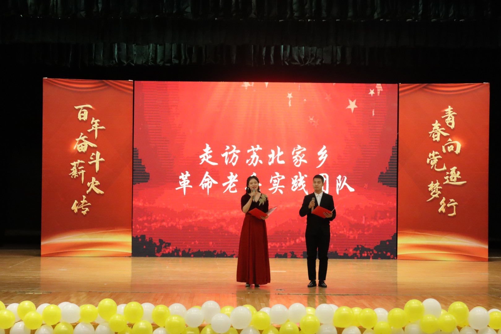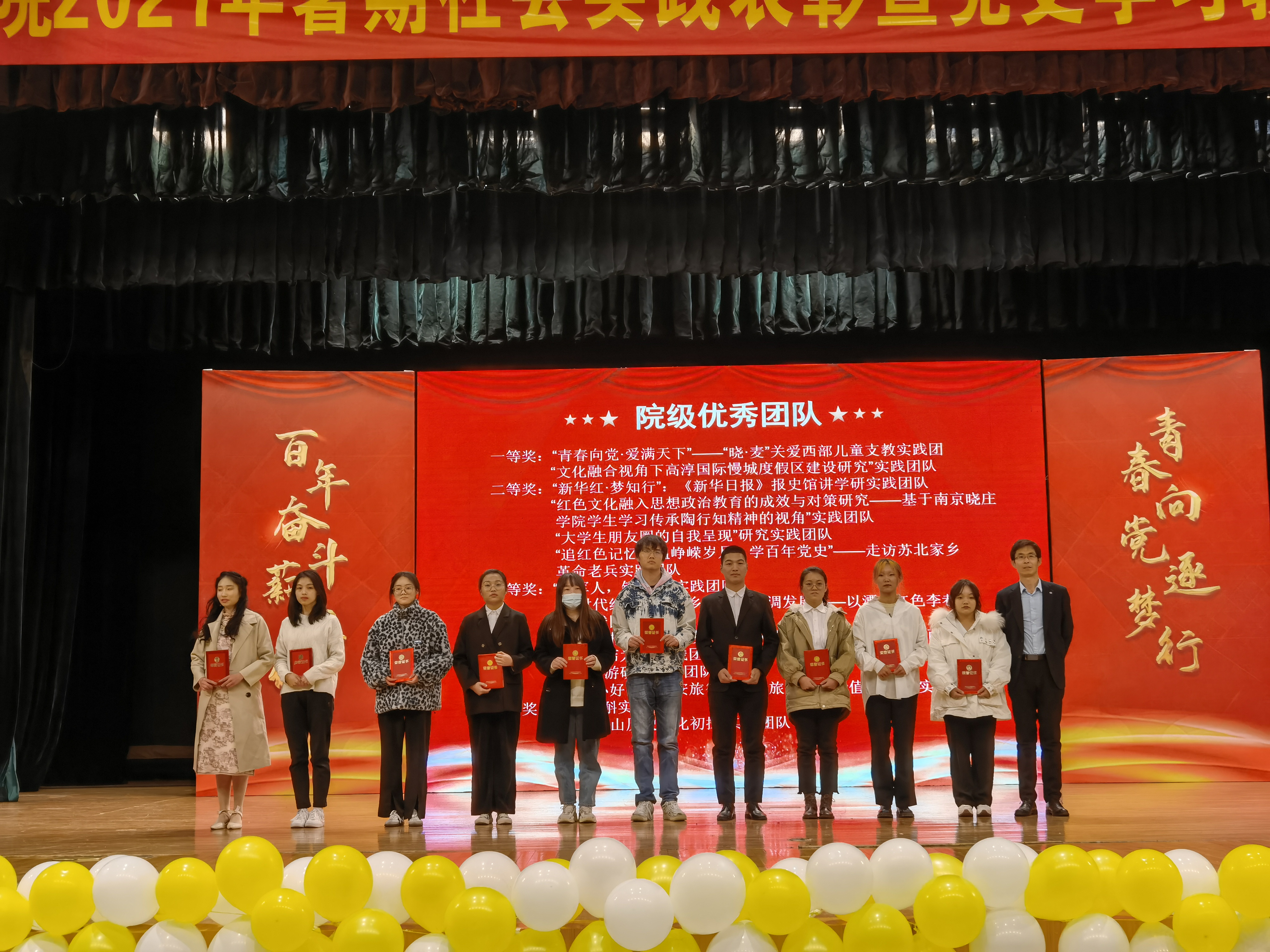 在暑期社会实践及党史学习教育展示环节,“晓·麦”关爱西部儿童支教实践团、走访苏北家乡革命老兵实践团队、《新华日报》报史馆讲学研实践团队及一群小好汉的新安旅行团实践团队、“老员工朋友圈里的自我实现”研究实践团队等五支团队分别以《初心向党,用爱照进支教之路》、《笔墨铸魂,以心凝聚党史荣光》、《铮铮铁骨,用肩担起党之重任》、《开拓创新,青年争做时代先锋》四个主题,以讲述、场景还原、舞台剧等方式真情分享了他们在社会实践中的难忘瞬间与丰硕成果。