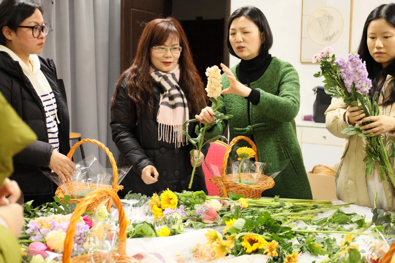 花艺与生活则是一场美的盛宴。公司余子萍老师为师生解读了花语,介绍了花色搭配,展示了鲜花构图。师生通过精心挑选、巧妙搭配,将一朵朵鲜花组合成美丽的花束,传递出对生活的热爱与追求。活动现场花香四溢,师生们的作品各具特色,展现了插花艺术的无穷魅力。