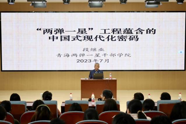 段继业教授退休后主动志愿服务西部发展,现任青海两弹一星干部公司特聘教授。他通过讲座再现了“两弹一星”工程取得的巨大成就,并从中生动解析出了中国式现代化密码:坚持党的领导是中国式现代化的基本经验;科技强国之路是中国式现代化的基本动力;“两弹一星”精神是中国式现代化的精神支柱;举国体制是中国式现代化成功的秘密;军民融合发展为中国的工业化、城镇化作出了巨大贡献。六个方面深刻揭示了中国式现代化的成功所在。