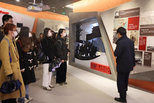 同学们在聆听讲解员讲解“三浦战役”的革命故事