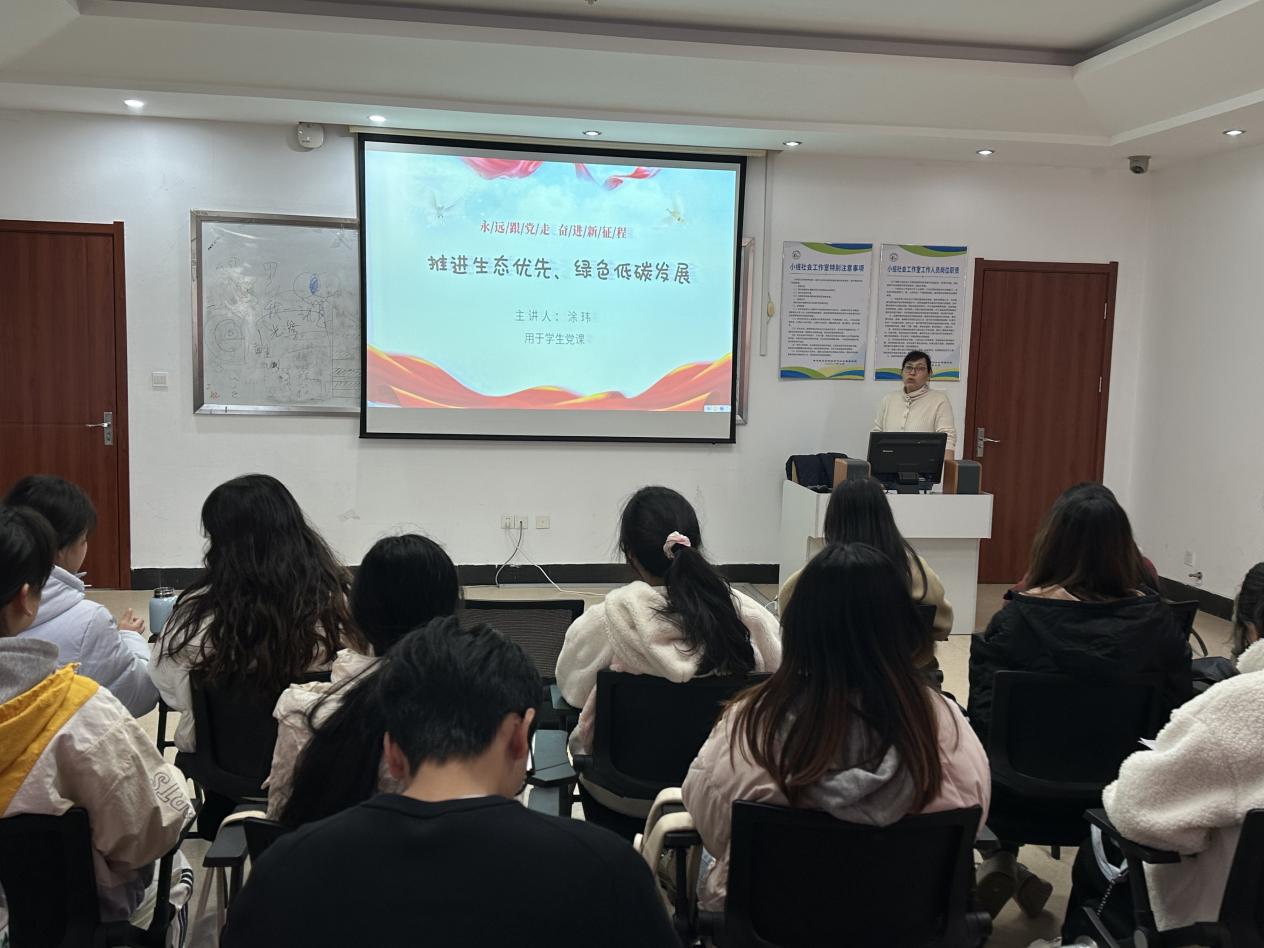 2024年11月26日下午,旅游与社会管理公司党委纪检委员、副经理涂玮在崇一楼文南213为公司2024年下半年入党积极分子开展第四次党课教学,本次党课的主题是《推进生态优先,绿色低碳发展》。